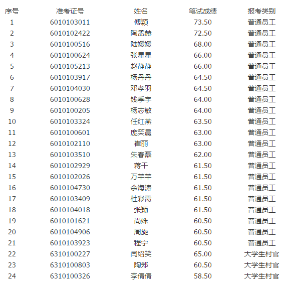 根據《長豐農村商業銀行2016年員工招聘公告》,依據考生筆試成績從高分到低分的順序(考生可登錄安徽農金招聘系統自行查詢筆試成績,本行不再另行電話通知),按照1:1.5比例核定面試入圍人員名單,2016年我行面向社會招聘普通員工面試入圍分數線為"60.5分"、大學生村官面試入圍分數線為"58.5分";法律、計算機專業報考入圍人員名單詳見安徽省聯社在招聘系統公告通知。現將相關事項通知如下:
