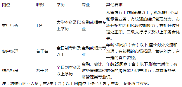 注:對銀行同業人員,有2年(含)以上同崗位工作經歷者,年齡、專業適當放寬。