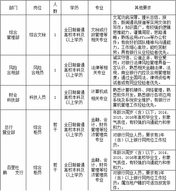 2016年大方富民村鎮(zhèn)銀行股份有限公司夏季招聘啟事