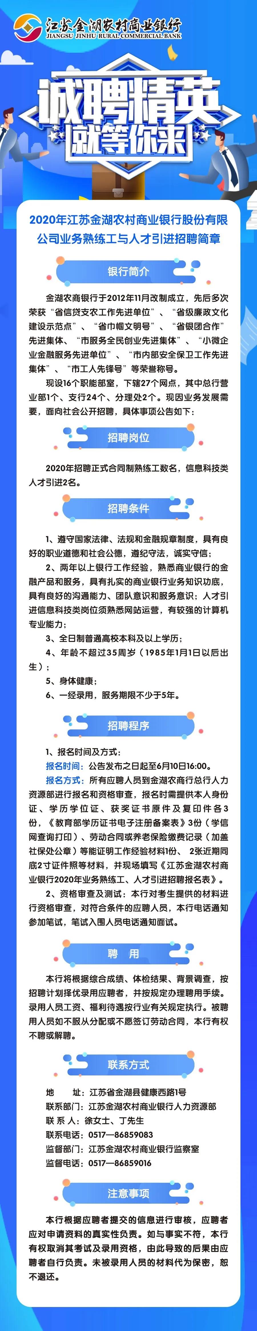 [江蘇]2020年金湖農商銀行誠聘英才公告
