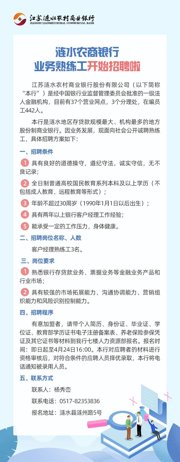 [江蘇]2020年漣水農商銀行業務熟練工招聘公告