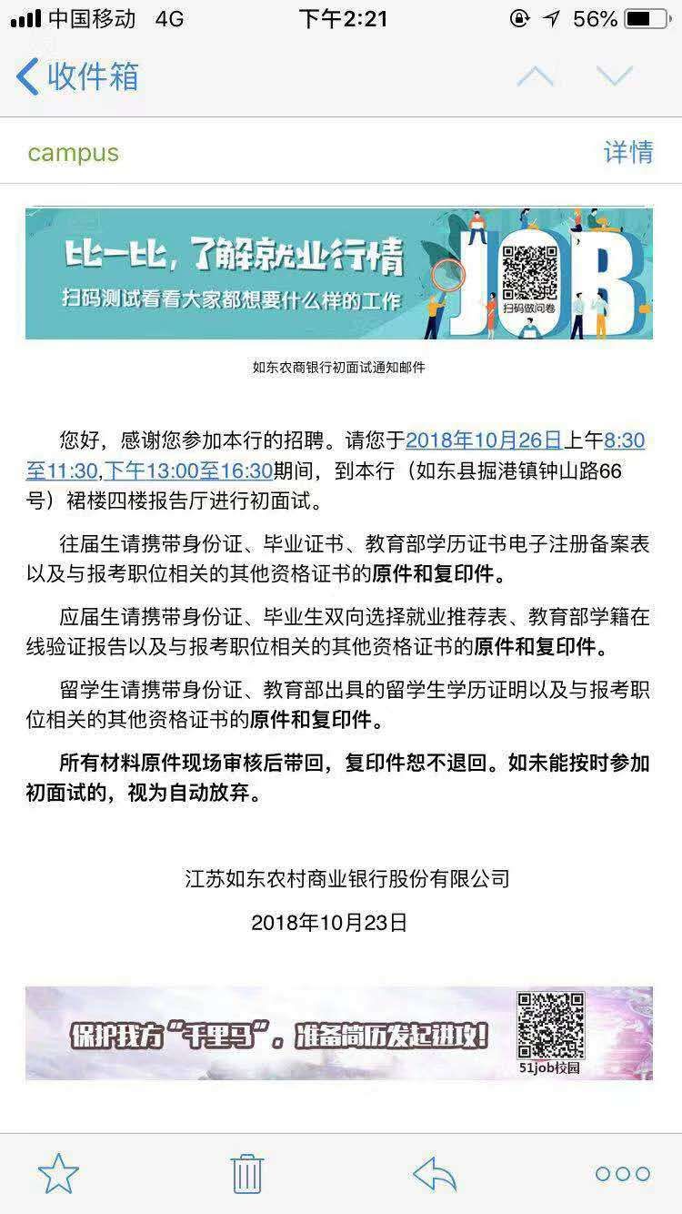 [江蘇]2019年如東農商銀行校園招聘初面通知