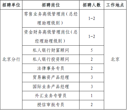 應(yīng)聘條件:35 周歲及以下;全日制大學(xué)本科及以上學(xué)歷;主修國際貿(mào)易、貿(mào)易經(jīng)濟等相關(guān)專業(yè),大學(xué)英語四級或以上;5 年以的上銀行業(yè)務(wù)工作經(jīng)驗或 3 年以上的從事與貿(mào)易融資、外匯相關(guān)產(chǎn)品營銷、管理經(jīng)驗;熟悉銀行國內(nèi)和國際貿(mào)易融資的相關(guān)業(yè)務(wù)、產(chǎn)品;了解外匯業(yè)務(wù)及相關(guān)政策;特別優(yōu)秀者可以適度放寬。