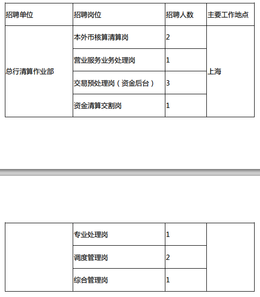 應(yīng)聘條件:35 周歲以下;全日制本科及以上學(xué)歷;2 年以上銀行工作經(jīng)驗(yàn);熟悉本外幣支付結(jié)算、清算,對(duì)公對(duì)私清算、境內(nèi)外清算等業(yè)務(wù)流程;具有較為全面的業(yè)務(wù)知識(shí)和較強(qiáng)的實(shí)務(wù)操作能力;具有柜面從業(yè)經(jīng)歷,銀行業(yè)務(wù)操作和管理資質(zhì),以及基金、證券、期貨公司或交易與清算機(jī)構(gòu)等工作經(jīng)歷者優(yōu)先。