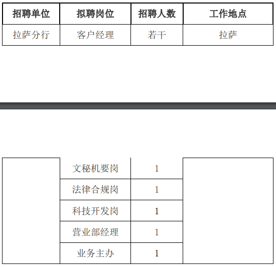 上海浦東發展銀行股份有限公司拉薩分行(以下簡稱“浦發銀行拉薩分行”)是總行直接管理的直屬一級分行,屬于國有股份制商業銀行。開業一年多以來,以“新思維·心服務”為引領,努力為客戶提供誠心、專心、用心、貼心、全心服務,取得了同業領先的優良業績,員工隊伍快速發展,樹立了良好的社會形象。因業務和機構發展需要,現對以下崗位進行社會公開招聘,經相關考試程序合格者,錄用為正式員工,將提供廣闊的職業發展空間和具有競爭力、成長性的薪酬福利。