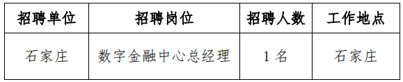 因業務發展需要,石家莊分行擬設立分行“數字金融中心”,定位為分行一級營銷部門,中心總經理面向社會及全國浦發系統內招聘。