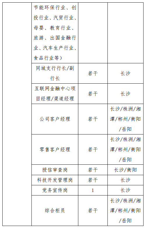 應聘條件:35 周歲以下;全日制本科及以上學歷;2 年以上銀行營銷工作經驗;具有儲蓄、銀行卡、理財、個人信貸、保險產品營銷等崗位工作經驗;具有較強的市場拓展、人際交往和溝通協調能力;客戶資源豐富,業績優秀。