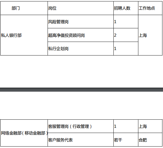應聘條件:40 周歲以下;經濟、金融、管理、法律等相關專業全日制本科及以上學歷;5 年及以上銀行及其他金融機構工作經歷;具有豐富的高端客戶服務經驗;熟悉高端客戶與私人銀行客戶的行為模式及投資消費特征;具備一定的投資管理、個人金融、公司金融、稅務等方面的專業知識;具備良好的文字表達能力及溝通協調能力,具有良好的親和力、學習能力及團隊合作精神;具備家族辦公室相關工作經驗或具備公司金融工作經歷者優先;具有AFP,CFP 資格者優先。