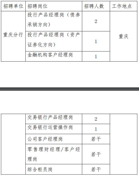 應聘條件:35 周歲及以下;全日制本科及以上學歷,有工科專業背景優先,碩士學歷優先;具有 2 年以上銀行、證券、大型會計師事務所等相關工作經驗,有成功的債券承攬、承做實操工作經驗者優先,有相關事業機構或總行(總部)從業經歷者優先;取得 CPA、CFA、律師等相關專業資格證書者優先;了解債券承銷業務相關的財務、法律、風險控制等相關專業領域知識;熟悉各類債券品種(含企業債、公司債、非金融企業債務融資工具、債權融資計劃等)特點;具有良好的職業道德,品行端正,無不良記錄,具備較強的工作責任心和團隊精神,能承擔較大的工作挑戰和壓力。