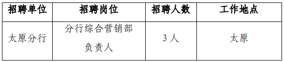 應聘條件:40 周歲及以下,全日制本科及以上學歷;五年以上銀行營銷工作經驗,現擔任商業銀行中層干部副職及以上職務,任職時間不低于兩年;熟悉金融法規和商業銀行各項業務、客戶資源豐富、業績優秀;具備銀行了解國家經濟政策及當地市場情況,熟悉銀行各類公司業務產品、業務流程;具備較強的經營管理能力和營銷推進能力;具備良好的職業精神,守法合規,誠實守信,嚴謹自律,以往工作中無重大失職記錄。