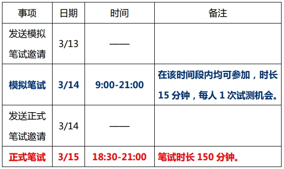 筆試將于 3 月 15 日舉行,為了幫助大家熟悉筆試流程,發(fā)揮出最佳水平,浦發(fā)銀行將于 3 月 14 日為大家安排 1 場(chǎng)模擬筆試。以下信息非常重要,敬請(qǐng)關(guān)注!