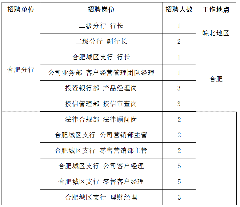 應聘條件:年齡40周歲及以下,全日制本科及以上學歷; 具有5年及以上銀行從業工作經驗,具有商業銀行二級分行副行長、一級支行副行長或一級分行部門副職及以上工作經歷;客戶資源豐富,業績優秀;條件特別優秀者可適當放寬。
