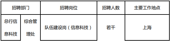 應聘條件:35 周歲以下;全日制本科及以上學歷;2 年以上金融或大型企業綜合管理工作經驗;有較強的團隊管理、計劃管理和文字組織能力;具有較好的溝通協調能力和文化傳播能力;熟悉各類辦公應用軟件,英語良好;具有銀行科技部門或相關工作經驗者優先。
