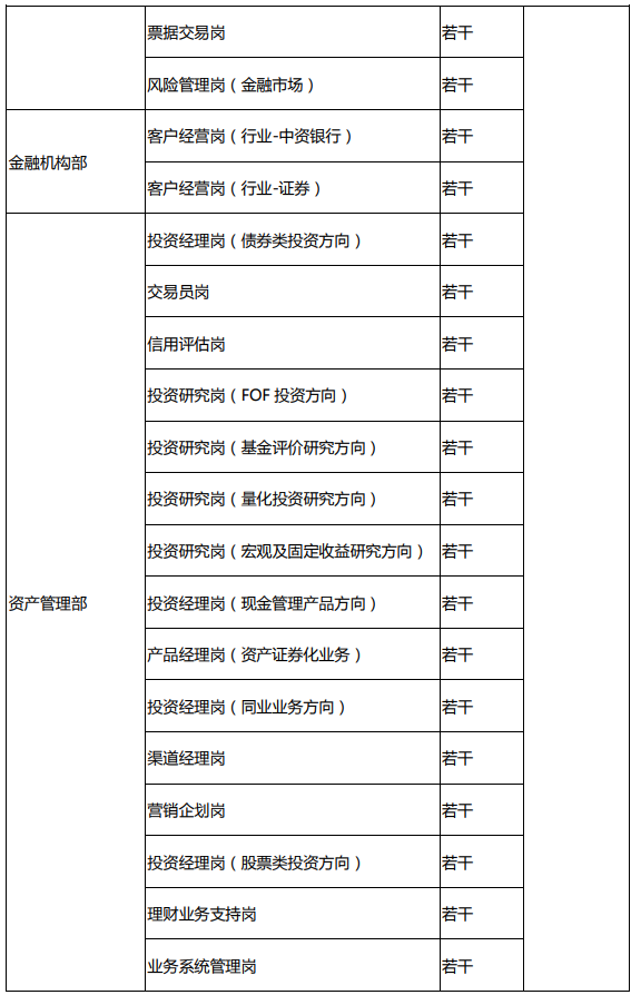 應聘條件:35 周歲以下;全日制碩士及以上學歷;5 年以上金融行業工作經驗,有銀行工作經驗者優先考慮;熟悉各類資管業務及不同交易對手相對應的交易結構,了解各類金融衍生品,有較強的風險合規意識;具有較強的文字表達能力,良好的溝通和協調能力;工作積極主動,具有一定的抗壓能力,可適應出差工作;有較強的團隊意識,服從各項工作安排,執行能力強。