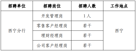 青海的全國性股份制商業銀行。因業務和機構發展需要,現對以下崗位進行社會公開招聘,經相關考試程序合格者,錄用為正式員工,將提供廣闊的職業發展空間和具有競爭力、成長性的薪酬福利。