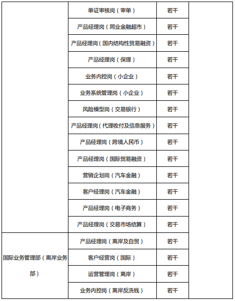 應(yīng)聘條件:35 周歲以下;經(jīng)濟(jì)、金融、外貿(mào)、管理、法律等相關(guān)專業(yè)全日制本科及以上學(xué)歷;3 年以上商業(yè)銀行產(chǎn)品部門產(chǎn)品設(shè)計(jì)、管理和企劃推進(jìn)工作經(jīng)驗(yàn),具有貿(mào)易融資、跨境投融資等國際業(yè)務(wù)經(jīng)驗(yàn)者優(yōu)先;熟悉國際結(jié)算、貿(mào)易融資等跨境業(yè)務(wù)產(chǎn)品及相關(guān)外匯管理政策;具有較強(qiáng)的工作責(zé)任心和較好的團(tuán)隊(duì)合作精神;具有較強(qiáng)的溝通、組織和綜合協(xié)調(diào)能力,具備良好的書面表達(dá)能力;英語流利,有海外工作經(jīng)歷者優(yōu)先考慮。
