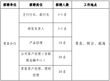 威海三地,共設有 32家經營機構。開業 16 年來,青島分行始終秉承“篤守誠信、創造卓越”的核心價值觀,認真貫徹總行發展戰略,積極參與地方經濟建設,各項業務持續健康發展,贏得了社會各界和廣大客戶的良好口碑。現根據業務發展和經營管理的需要, 廣納天下英才,共赴錦繡前程!