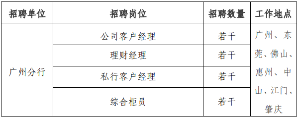 應聘條件:28 周歲及以下;全日制本科及以上學歷,2年以上銀行相關工作經驗;思想品德端正,無不良歷史記錄;熟悉會計、出納、儲蓄、人民幣支付結算及賬戶管理等業務,技能熟練,業務扎實;形象氣質佳,具有較強的服務、團隊合作意識及溝通表達能力。