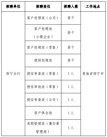 上海浦東發展銀行股份有限公司西寧分行于 2011 年 12 月獲得監管開業批復,截至 2019 年 11 月末,西寧分行轄內共 7 家網點(含分行營業部)。因業務和機構發展需要,現對以下崗位進行社會公開招聘,經相關考試程序合格者,錄用為正式員工,將提供廣闊的職業發展空間和具有競爭力、成長性的薪酬福利。