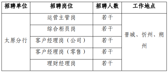 應聘條件:年齡 28 周歲及以下,全日制本科及以上學歷;具有 1 年及以上銀行相關工作經驗;形象氣質佳,具備良好的溝通表達能力及服務營銷意識。