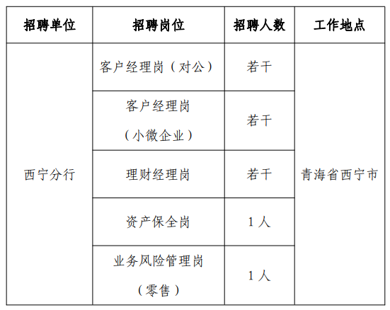 上海浦東發(fā)展銀行股份有限公司西寧分行于 2011 年 12月獲得監(jiān)管開業(yè)批復,截至 2020 年 3 月末,西寧分行轄內共 8 家網點(含分行營業(yè)部)。因業(yè)務和機構發(fā)展需要,現(xiàn)對以下崗位進行社會公開招聘,經相關考試程序合格者,錄用為正式員工,將提供廣闊的職業(yè)發(fā)展空間和具有競爭力、成長性的薪酬福利。