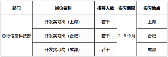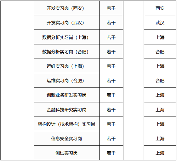 實習人員條件:計算機、金融等相關專業本科及以上在校生;熟悉常用辦公軟件,熟悉常用的開源軟件的使用;具有較強的工作責任心、良好的團隊合作精神以及協調溝通能力;積極上進,能夠承擔壓力、接受挑戰。