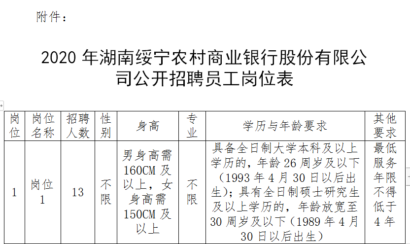 附件:《2020年湖南綏寧農(nóng)村商業(yè)銀行股份有限公司公開招聘員工崗位表》