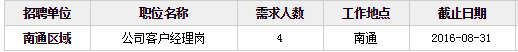 2016年蘇州銀行南通地區社會招聘公告已在銀行招聘網發布,報名時間截至2016年8月31日,詳情如下: