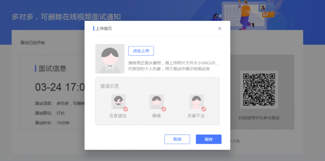 2.進入面試報名頁面,上傳真人頭像和個人簡歷