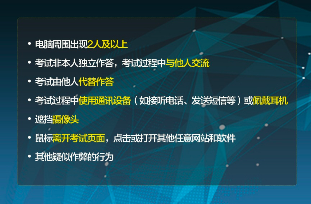 請重點關注如下行為,一旦出現將可能被視為作弊,經綜合判定為作弊者,考試成績作零分處理。