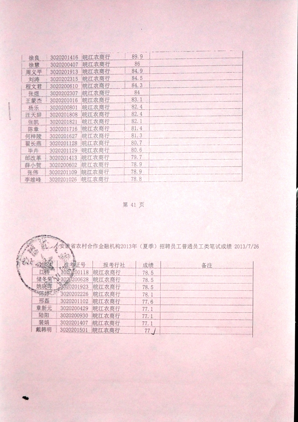 現將銅陵皖江農村商業銀行2013年夏季招聘普通員工筆試入圍名單公示,名單見下圖,從本通知發布起,未入圍考生可撥打0562-8810296查閱考試分數。