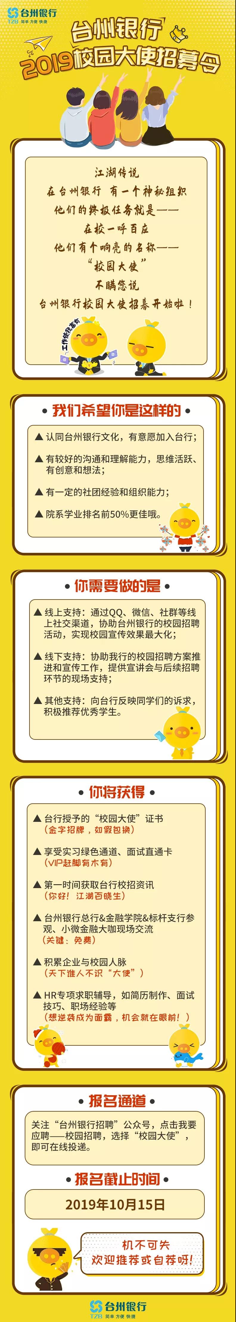 主頁 > 城市商業銀行招聘 > 臺州銀行招聘 > [全國]2019臺州銀行“校園大使”招募令