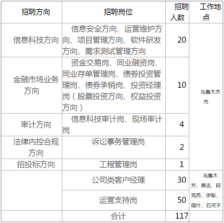 烏魯木齊銀行股份有限公司(以下簡稱“烏魯木齊銀行”),成立于1997年12月20日,是新疆第一家具有獨立法人資格的地方性股份制商業銀行,2015年12月經中國銀監會批準更名為烏魯木齊銀行。截至2018年12月末,全行總資產1526億元;共有93家營業網點(含社區銀行、小微支行)。我行始終把“為員工搭建最好的平臺”作為企業使命,為員工提供良好的培訓、職業發展機會和薪酬福利待遇。根據業務發展需要,現面向社會公開招聘,具體招聘公告如下: