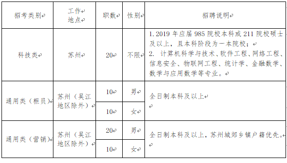 本次招聘員工70名(其中:科技類20名,通用類50名),職位是總行金融科技部和蘇州城郊支行員工。具體要求如下: