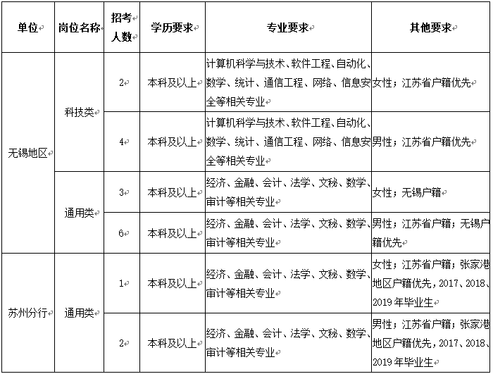 3、蘇州分行業務崗位:2017年、2018年、2019年境內外高等院校全日制本科及以上學歷畢業生,專業符合對應崗位相關要求,重點院校優先。