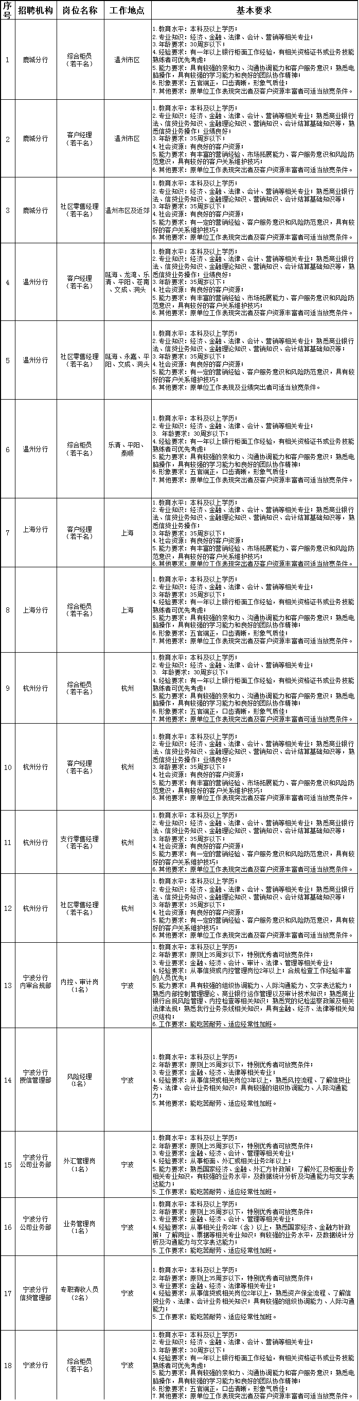 現根據工作需要,溫州銀行部分職位面向社會公開招聘。具體情況如下: