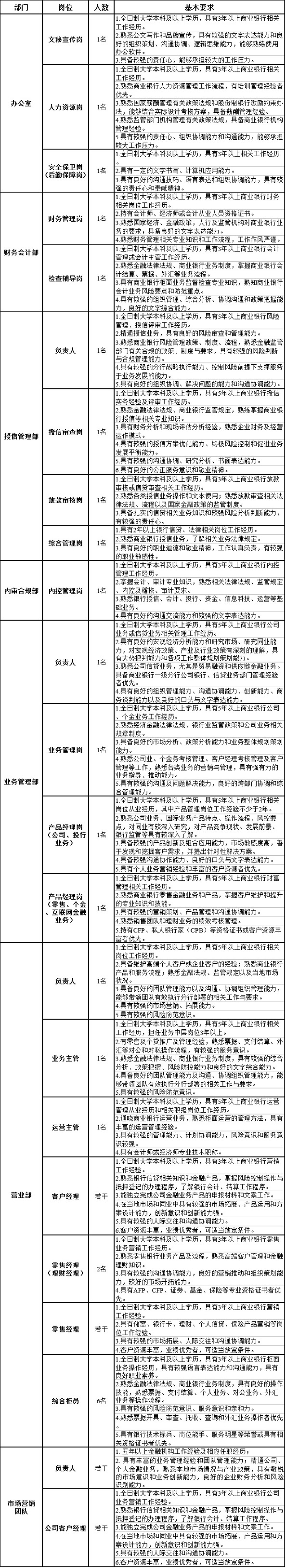 (三)部門負責人年齡在45周歲以下;部門內設中層干部年齡在40周歲以下;客戶經理、綜合柜員及一般管理人員年齡在30周歲以下;特別優秀的年齡可適當放寬。