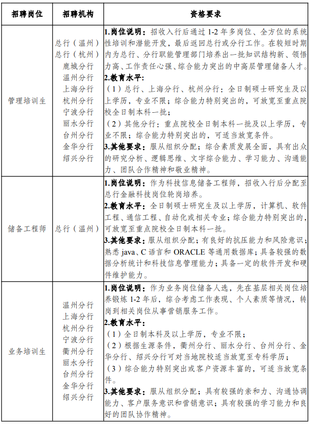 中國銀行業(yè) 100 強、中國最佳城市商業(yè)銀行、全國文明單位等一系列榮譽稱號。溫州銀行秉承“以人為本、德才兼?zhèn)洌吮M其才、人事相宜”的選人用人理念,為廣大人才搭建施展才華的廣闊發(fā)展平臺,現(xiàn)誠邀全國優(yōu)秀青年學子加盟。