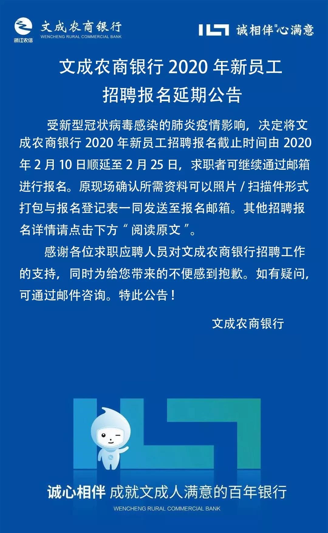 [浙江]2020年文成農(nóng)商銀行新員工招聘報(bào)名延期公告