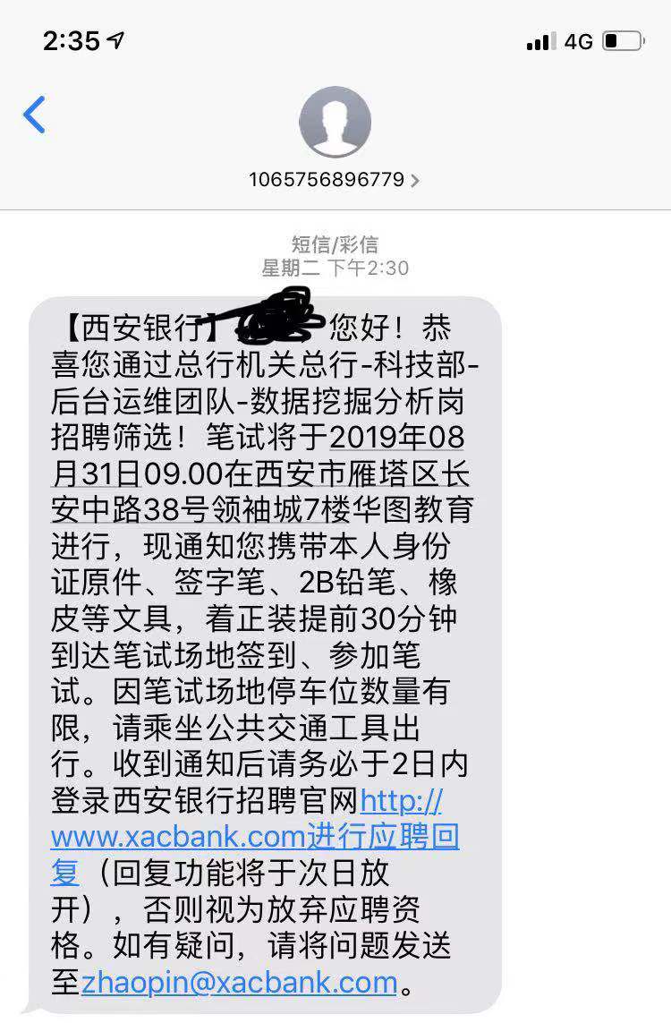 [陜西]2020年西安銀行總行科技部校園招聘筆試通知