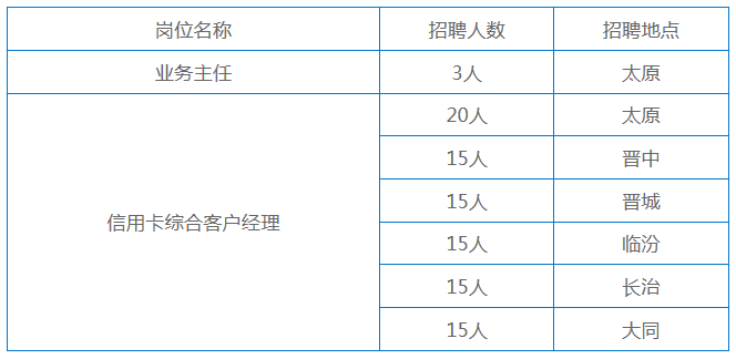 山西經濟社會發展,服務三晉百姓生活,依法經營,穩健經營,文明經營,業務持續快速健康發展,風險控制能力不斷增強,盈利水平顯著提升。現因業務發展及內部管理需要,特面向社會人員公開招聘信用卡中心業務崗優秀人才。現將有關事項公告如下: