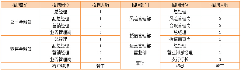 所有崗位均要求具有較強(qiáng)的敬業(yè)精神、創(chuàng)新意識(shí)和團(tuán)隊(duì)合作意識(shí);品行端正,無(wú)違規(guī)違紀(jì)等不良行為,在銀行業(yè)或監(jiān)管機(jī)構(gòu)無(wú)不良記錄;業(yè)績(jī)、能力特別優(yōu)秀者,年齡和學(xué)歷條件可適當(dāng)放寬。