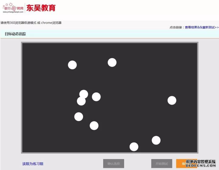屏幕上會出現10個圓球,其中有3-5個圓球將閃爍,閃爍的圓球即為需要追蹤的目標,請記住它們。追蹤目標閃爍后,10個圓球都會運動;但圓球運動停止后它們會變成正方形,請用鼠標選出之前閃爍的追蹤目標進行作答。鼠標點擊一次即為選中,被選中的目標顯示橙色邊框,在點擊一次則取消選擇。