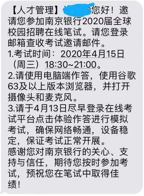 2020南京銀行春季校園招聘在線筆試通知