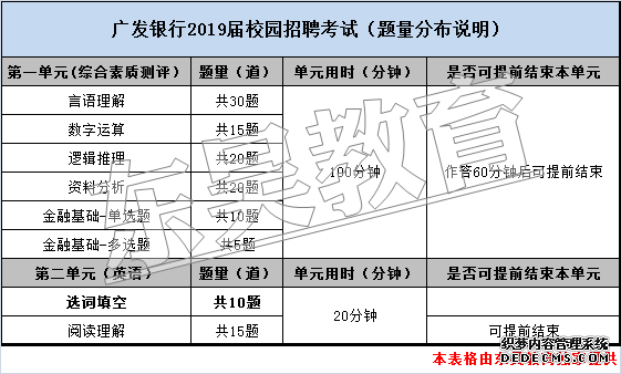2020年廣發銀行春季校園招聘考試已于2月啟動,報名截止時間:2020年3月31日,各省分行報名、初選、考試、面試、體檢和錄用等環節具體時間請以各省公告為準,詳情可查看:2020年廣發銀行校園招聘公告匯總(http://www.llwin.cn/gdfzyh/2020-02-14/88448.htm),筆試內容為綜合素質測評、英語共兩個部分。廣發銀行校園招聘考試歷年真題參考銀行招聘網聯合東吳教育出版的《銀行招聘考試歷年真題(2020最新版)》。