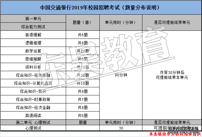 根據歷年中國交通銀行春季校園招聘考試時間來看,2020年中國交通銀行春季校園招聘考試預計將在3月啟動,4月筆試(疫情期間或有延遲),中國交通銀行校園招聘筆試內容科目分為:通用素質能力測試(EPI)、綜合知識、英語、心理測試四個部分。中國交通銀行校園招聘考試完整版歷年真題在銀行招聘網聯合東吳教育出版的《銀行招聘考試歷年真題(2020最新版)http://www.dwjy.com/book/》有呈現。