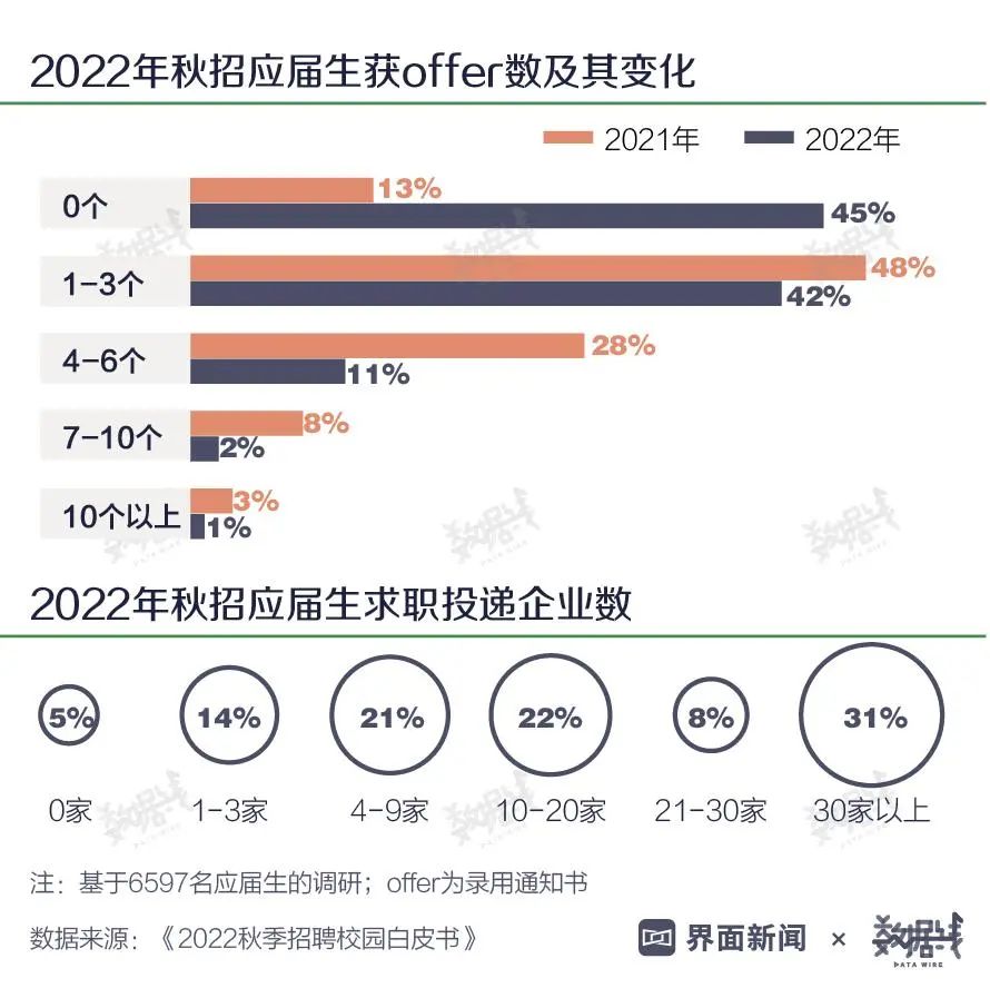 據《2022秋季校園招聘白皮書》,在調研的6597名應屆生中,有61%的應屆生在2022年秋招中投遞超20家企業,同比增長22%,甚至31%的學生投遞超30家以上。在2022年秋招中,有45%的應屆生收到企業錄用通知數量為0,而2021年秋招該比例僅為13%。