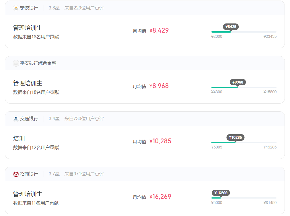 在了解各崗位的薪資之前,同學(xué)們先參考一下各家銀行的平均薪資水平,一般來說,各崗位的薪資受銀行整體的薪資影響也比較大。