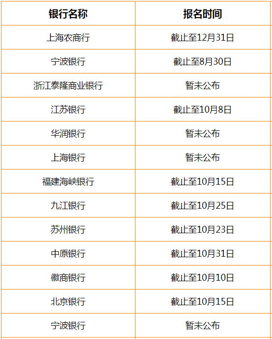 銀行招聘分為春季招聘和秋季招聘,雖然各大銀行報考時間都不同,但是根據(jù)往年的考試時間安排來看,秋招報名時間集中在每年的9-10月份,而春招的報名時間則集中在次年的2-3月份。