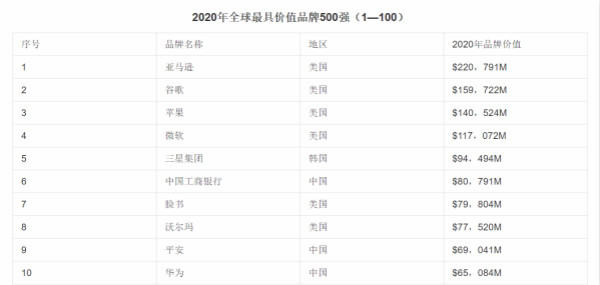 2020年3月,入選2020年全球品牌價(jià)值500強(qiáng)第6位。